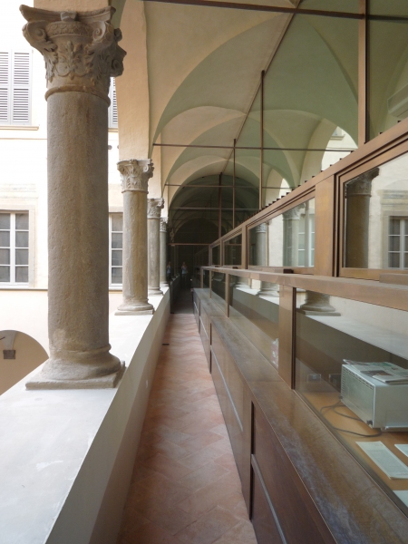 Per consentire l’utilizzo dei locali adibiti a biblioteca posti al 1° piano del corpo di fabbrica nord-est l’Ente Committente aveva chiesto la chiusura del loggiato aperto verso la corte , tale da consentire l’accesso ai rinnovati locali della biblioteca da un luogo “caldo”,senza uscire all’aperto.